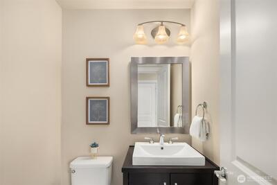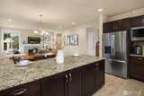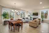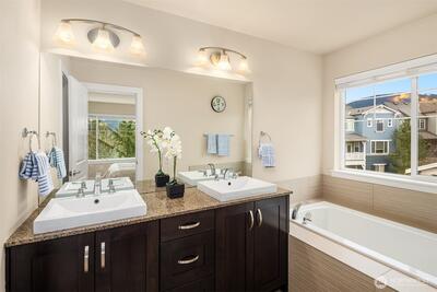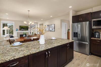 Former model home and immaculate move-in ready detached home in West Highlands Park offering nearly 2000 sq ft of living space. The main level showcases a light-filled Great Room with spacious living and dining that seamlessly flows to the huge Espresso colored kitchen with expansive countertop and cabinet space - perfect for both chefs and entertaining. A walk-in pantry and adorable nook leads to the covered deck. Newly installed white oak floors run throughout the entire home for ease, style & continuity. This 3-bedroom home features a versatile entry-level bedroom or private office with an ensuite full bath, making it ideal for guests, multigenerational living or remote work. Upstairs, you’ll find two spacious bedrooms each with their own private bathroom. The primary suite captures beautiful mountain views of the Issaquah Alps and the Olympics on a clear day. Large laundry room with side-by-side machines and built-in storage for ultimate convenience. This home is uniquely sited