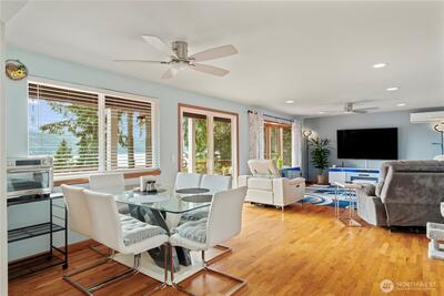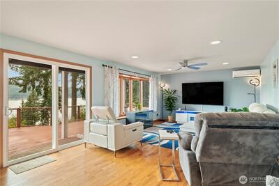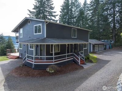 Imagine waking up to awe-inspiring views of Hood Canal, watching orcas, eagles, otters and other wildlife from every bedroom in this magnificent two-story sanctuary! This 4-bedroom, 3-bathroom home has been meticulously upgraded with new paint, windows, doors, and flooring. Every bathroom has been artfully remodeled, including the master ensuite, which includes a large walk-in closet. The open-concept living room and kitchen are perfect for entertaining, while the new ductless A/C unit ensures comfort year-round. Add a whole-house generator hookup, an oversized three-car garage with an E-car charging station hookup, hot tub, and a private beach and boat ramp. A dedicated office/playroom makes this property functional as well as beautiful.