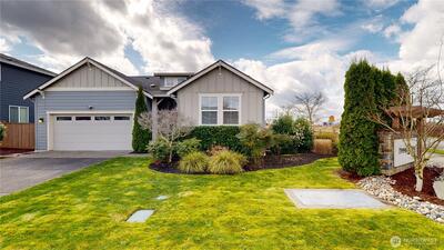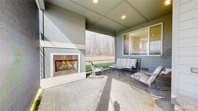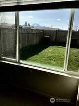 Imagine waking up to Mount Rainier literally in your backyard! This beautiful Enumclaw home on a spacious corner lot offers breathtaking, front-row mountain views. The thoughtful layout features 2 bedrooms plus a versatile den/office (functioning as a 3rd bedroom) to ensure you have the dedicated workspace or guest room you need. The heart of the home is a gourmet kitchen boasting quartz countertops, a large island, stainless steel appliances, microwave, and a 5 burner gas cooktop. Natural light floods the inviting great room, highlighting the warm luxury vinyl plank flooring and cozy gas fireplace. Step outside to your private oasis: the light-filled dining area leads to a covered patio featuring an outdoor fireplace and privacy screens all the way around—creating the perfect "outdoor room" for year-round relaxation with a stunning mountain backdrop. The primary suite serves as a true retreat with a walk-in closet and a well-appointed bath featuring a dual-sink vanity and glas