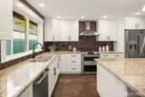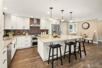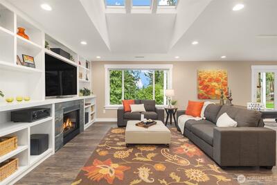 It's "Love at first sight" with this light filled, turn-key 1-story home. Live the waterfront dream! Beautifully remodeled, light filled rambler in Waverly Hills. Only community of 106 homes to have access to 400' of community beach, overnight mooring, boat launch, picnic/BBQ area, beach/swim area & dock on Lake Sammamish-a true sense of community. Stylishly updated & upgraded throughout ~ this home features an open, easy-living floor plan. A stunning kitchen remodel with shaker cabinets, quiet-close drawers & pull-outs, granite countertops, stainless steel appliances, and a large eating island. GE dual oven & KitchenAid refrigerator. Fresh trim and craftsman doors. Living room with built-in cabinetry, gas fireplace, wired for surround sound and a massive skylight. Remodeled primary suite/guest baths. French doors to expansive, partially covered composite deck & private yard. Newer Milgard Tuscany vinyl windows, two-way blinds, CertainTeed 50-year roof (2008), newer 95% efficiency furn