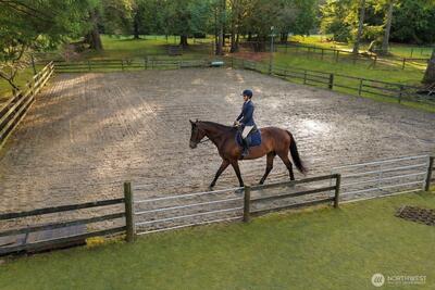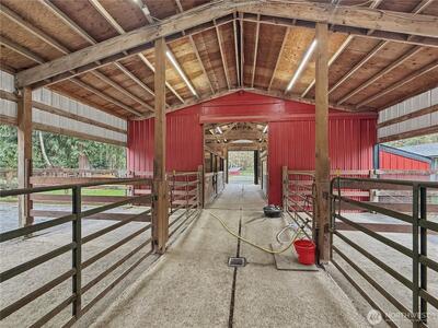 Exceptional equestrian estate tucked behind a gate at the end of a paved dead-end road, offering privacy, functionality, & beautifully maintained grounds. This thoughtfully designed property allows you to view your animals from multiple large windows & decks as they move through alleyways to three spacious fenced pastures, or configure into two smaller pastures for rotational use.The 60' x 30' barn features 3 stalls, 4 run-ins, hay storage, tack room, and additional workspace. Well-drained paddocks include French drains and fresh crushed gravel footing leading to a loafing shed, providing year-round usability. A 72' x 120' riding arena with updated LED lighting supports schooling and evening riding.More outbuildings include a covered dog kennel and two smaller covered structures suitable for poultry, small livestock, or storage. The 32' x 25' two-bay garage includes a separate room with shelving ideal for a workshop or hobby space.Major recent improvements include new 30-year compositi