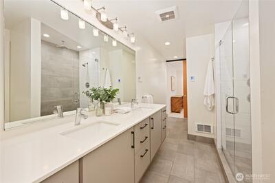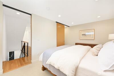 Modern comfort meets Northwest charm in this newer upscale townhouse nestled on a quiet dead-end street in desirable Magnolia. Enjoy peaceful, unobstructed views of protected green space and an unbeatable location just two blocks from Discovery Park, with an easy stroll to the Ballard Locks and Magnolia Village. This thoughtfully designed 3-bedroom, 2-bath, corner unit home features an open-concept main living area ideal for everyday living and entertaining. The stylish kitchen is outfitted with stainless steel appliances, a gas range, and a generous island that flows seamlessly into the dining and living spaces. A gas fireplace adds warmth and ambiance to the inviting living room. The private top-floor primary suite offers a relaxing retreat with a spa-inspired bathroom and walk-in closet. Two additional bedrooms on the first floor share a full bath—perfect for guests, home office space, or flexible living. Distinctive design details including rustic wood accents, rift-sawn oak floo