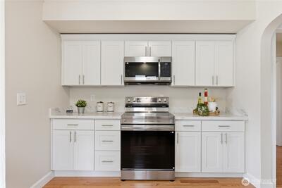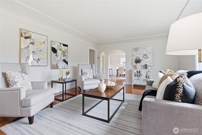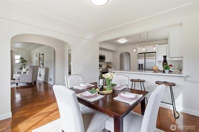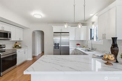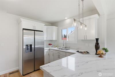 Discover the distinctive charm of this beautifully remodeled 3-bedroom, 1.5-bath Art Deco-inspired home in SE Tacoma. Offering 2,308 square feet, this spacious rambler with a fully finished basement showcases signature Southwest architectural details, including a classic stucco exterior and graceful interior arches that create warmth and character throughout. Thoughtfully updated, the home features a brand-new kitchen with modern cabinetry and countertops, complemented by refreshed bathrooms with new vanities, showers, toilets, and sinks. Refinished flooring adds timeless appeal, while fresh interior and exterior paint provide a crisp, move-in-ready feel. Built-in storage cabinets enhance functionality, and landscaped grounds add to the home’s welcoming curb appeal. Large windows invite abundant natural light, creating an open and airy atmosphere. The detached alley-access garage may present intriguing potential for a future DADU, offering added versatility and long-term investment a
