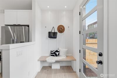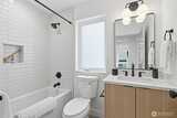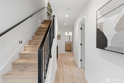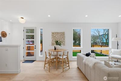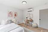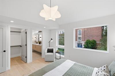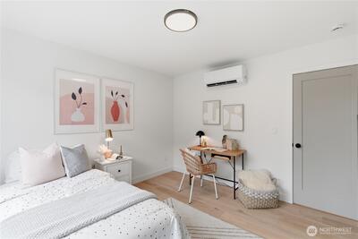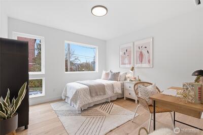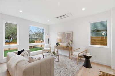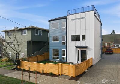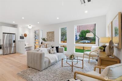 Final home with this floor plan remaining! New construction Ballard home with exceptional street presence and thoughtful design throughout. A spacious front yard enhances curb appeal and provides a welcoming entry. Soaring ceilings and large windows bathe every room in natural light, creating an open and inviting atmosphere. The 3-bedroom, 2-bath layout offers versatile living spaces perfect for those who work from home. Premium finishes include Bellmont cabinets, engineered hardwood throughout—no carpet—and heated floors in both bathrooms for year-round comfort. Mini-split A/C in every room ensures climate control through Seattle's warmer months. The primary bathroom features motion sensor lights and a dedicated bidet outlet for added convenience. Walk to NW 65th eateries and Downtown Ballard's vibrant shops and restaurants with an impressive 88 Walk Score and 95 Bike Score. Quick access to Golden Gardens Park and 15th/99 makes SLU/Downtown commutes a breeze. Top-ranked schools ne