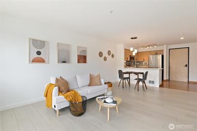 Enjoy Urban living at its finest. This immaculate 1 bedroom unit on the 4th floor features large west facing windows with beautiful territorial & city views, in-unit laundry, hard surface flooring, quartz countertops, updated appliances w/smart home features, custom closet systems, storage unit, & dedicated parking in a secure garage. Well-run HOA covers central hot water, sewer/garbage, & EQ ins. Expansive shared deck & common areas on 2nd floor. You could not ask for a better location. With a Walk Score of 89 you are just a block from the coming Judkins East-link Light Rail station, close to local coffee shops, grocery, & restaurants. Just a quick jaunt away you'll find T-Mobile Stadium & Lumen Field for sports & concert events.