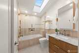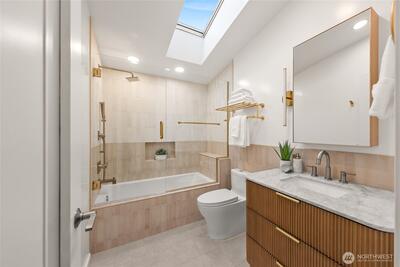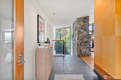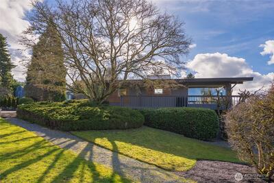 Paul Kirk custom home capturing sweeping Olympic sunset, city, and mountain views in the coveted Somerset neighborhood. Set at the top of a quiet coner lot, this timeless mid-century modern blends stone, glass, and natural wood into clean architectural lines and light-filled spaces. Vaulted, beamed ceilings and walls of windows frame an open, airy floor plan designed for both everyday living and memorable entertaining. The chef’s kitchen with high-end stainless appliances anchors the main level, while a spacious rec room with wet bar, skylights, and seamless access to the view deck extend the living areas outdoors. Recent improvements include a new roof (2021), new HVAC system with furnace, A/C (2026), water heater (2023), remodeled main level with new laundry (2023), and updated second floor (2025). Thoughtful landscaping, automated irrigation, and a private sport court enhance the corner lot setting. Enjoy access to a private community pool shared by only a small group of 11 homes