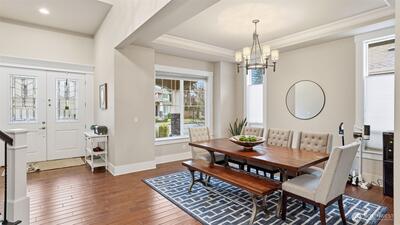 American Classic resale in the Enclave featuring the sought-after Langley floor plan. Two-story foyer with sweeping curved staircase and 10-foot ceilings. Hardwood floors throughout main living areas. Formal dining with butler’s pantry flows to chef’s kitchen with commercial-grade appliances, 60" side-by-side refrigerator/freezer, oversized island, walk-in pantry, and ample cabinetry. Expansive great room with gas fireplace and walls of windows opens to a professionally designed, fully renovated backyard retreat with covered patio, paver patio, turf, and concrete poured side yard, ideal for entertaining, relaxing, and low-maintenance enjoyment. Main floor guest suite with adjacent bath provides flexibility for guests or home office. Upper level features primary suite with vaulted ceilings, cathedral-style windows, and spa-inspired 5-piece bath with soaking tub, separate shower, dual vanities, and walk-in closet. Additional bedrooms, full bath, and bonus room complete the uppe
