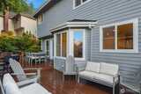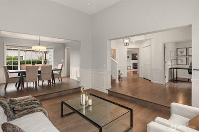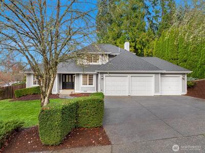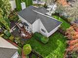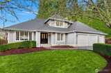 Northwest Contemporary Home in Bridlewood - Sited high on a large sunny corner lot with territorial views, this recently updated home offers voluminous living spaces blanketed with rich oak hardwoods. On the main level, a classic circular floor plan offers utility and flow as well as good separation of space. At once intimate and grand, the sunken living room features ample, south-facing mullioned windows, wainscotting and vaulted ceilings. Recently refinished, the kitchen features a bay window breakfast niche; island with seating; stainless appliances including gas range and armoire fridge; concealed hinge cabinetry; under-cabinet lighting; slab quartz counters and under-mount stainless trough sink. Powder room, laundry and home office complete the main level. Upstairs, the primary suite features a walk-in closet plus bath with heated tile floor, dual vanities, soaking tub and separate shower. Two more bedrooms and a full hall bath complete the upper level. On a premium cul-de-sac lo
