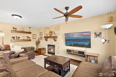 Set on a spacious acre+ lot just a short stroll to Lake Tapps Park, this beautifully maintained two-story home offers flexibility, comfort, and room to grow. The light-filled kitchen features granite counters, stainless steel appliances is open concept with an eat-in island, and a walk-in pantry, and a large gathering room with gas fireplace—perfect for everyday living and effortless entertaining. The versatile floor plan includes a main floor office, designated laundry, formal living and dining spaces. Upstairs has been thoughtfully configured as a secondary living space with private access, electric fireplace, second washer/dryer, and kitchen prep area offering incredible potential for multi-generational living or an easy conversion back to a luxurious primary suite with a walk-in closet and en suite bath. In total, enjoy three bedrooms, a large bonus room, and 2.5 bathrooms. Step outside to a fenced backyard with an expansive deck—ideal for entertaining or relaxing. The outbuil