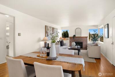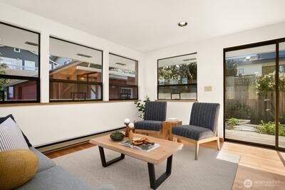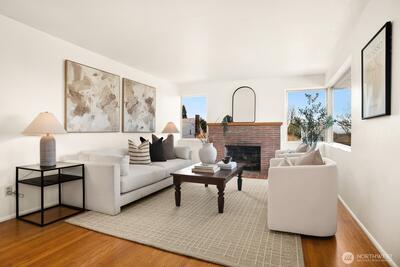 Prominently sited on a sunny corner lot, in a quiet enclave at the crest of Magnolia, you’ll love the possibilities of this mid-century classic. Subtle original exterior details give a nod to the mod while the interior opens to light and airy living spaces, with western outlooks & filtered Olympic Mtn views. A flexible floorplan gives you lots of options to explore. Spacious living room with room for dining. Adjacent to the open kitchen, you’ll love the family room flex space – with walls of windows looking out to backyard gardens. The perfect place to hang out and relax or create a larger, formal dining room. Two, sweet, serene main floor BRs, one with sliders to the yard. The lower floor, with separate entries, is host to a media/gaming rec room, 3rd BR, bath and add’l spot for home office/storage. Large, detached 2 car garage with separate bays – perhaps one is a great spot for a deluxe home gym. Great space as it is, or explore the possibilities of expansion to pick up