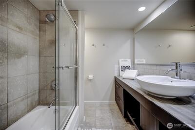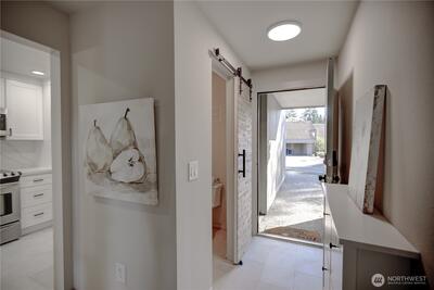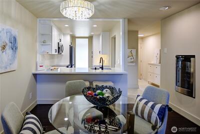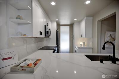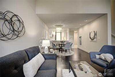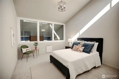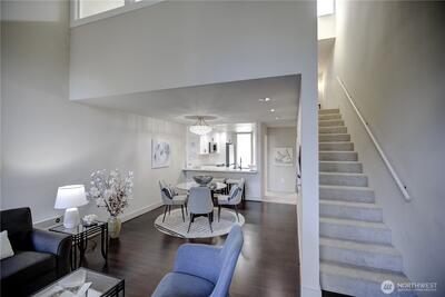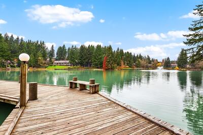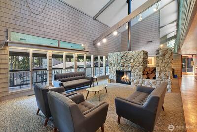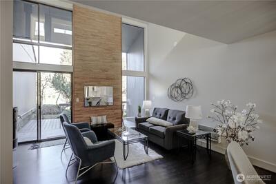 Welcome to this stylish townhome with floor to ceiling windows and an inviting interior. Just steps to the lake! Home boasts quality wood floors, new carpeting, new lighting. Entertain in the stunning kitchen with new quartz counters/seating bar, new white cabinets with black pulls, quality stainless appliances. Main floor half bath has updated vanity with Italian vessel sink. Primary bedroom features vaulted ceilings and new privacy windows overlooking the living room below. Second bedroom could also be an office or den. Modern style full bath features custom tile shower with hi-end glass doors. New full-size washer/dryer. Entertain on the large view deck or relax indoors by the fireplace. NO SPECIAL ASSESSMENTS. Attached carport parking with locked storage plus extra parking nearby. Sixty-01 has gated entry, four swimming pools, three lakes, 83 acres of trails/parks, clubhouse, gym, pea patch and much more!