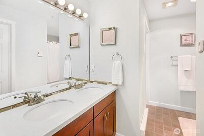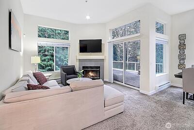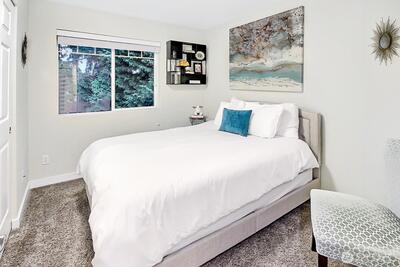 Looking for a quiet, move-in-ready condo with privacy and an easy commute? This like new, top floor end unit in Harbor Reach at The Lakes offers peaceful living with no neighbors above you, great natural light, and quick access to I-5 and Highway 167. Inside, vaulted ceilings and an open floor plan make the home feel bright and airy. The updated kitchen including quartz countertops and stainless steel appliances flows easily into the dining and living area. It’s a comfortable space for everyday life and easy entertaining. Step outside to your private, spacious deck, perfect for coffee in the morning or relaxing at the end of the day. The primary suite feels like a retreat, with double sinks, quartz counters, a walk-in closet, and an oversized tub/shower. The large second bedroom and full bath work well for guests, a home office, or extra space to spread out. You’ll love the direct access oversized one-car garage with extra storage. The community clubhouse is just a short walk away