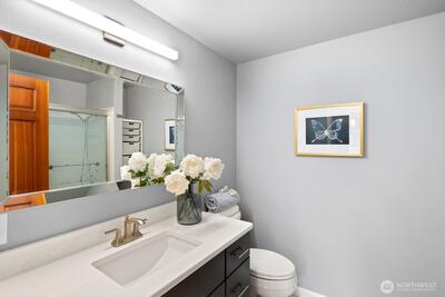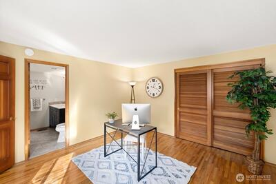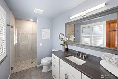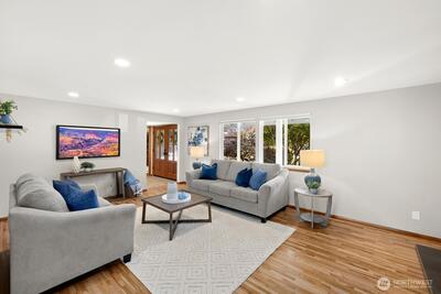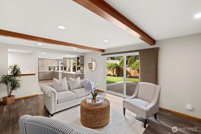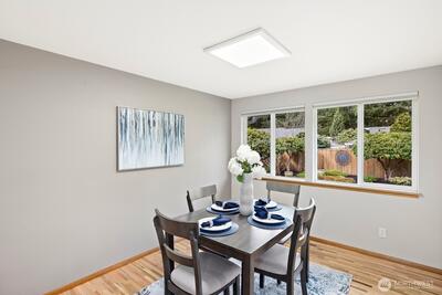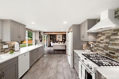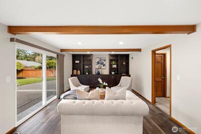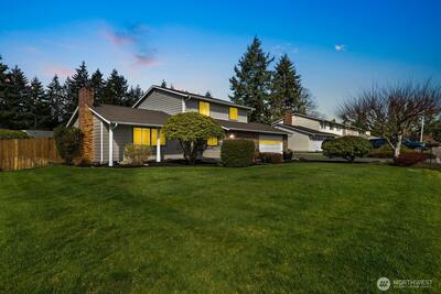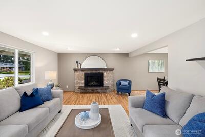 Welcome to this storybook Fircrest 2-story, where timeless charm meets a spacious, functional layout. Offering 4 bedrooms and 2.75 baths across 2,000 SF of living space, this home features a highly desirable floor plan with a main-level bedroom and bath, plus three additional bedrooms upstairs—including a generously sized primary suite. Step inside to find warm hardwood floors, original woodwork, and inviting formal living and dining spaces. The light-filled living room centers around a cozy gas fireplace, while the expansive fully remodeled kitchen opens to a large family room—perfect for everyday living and entertaining. Thoughtful updates and insulated windows and newer HVAC system provide comfort and efficiency throughout. Situated on a beautifully manicured lot, the fully fenced backyard offers a private, park-like setting with ideal western exposure for sunny afternoons. Enjoy outdoor living on the patio, surrounded by mature landscaping and lush lawn. Additional highlights i