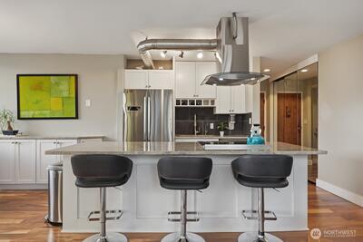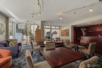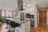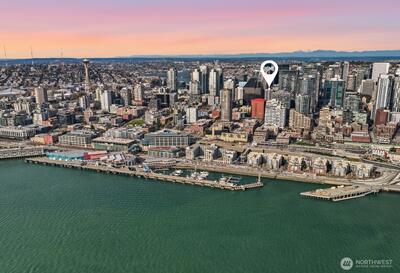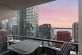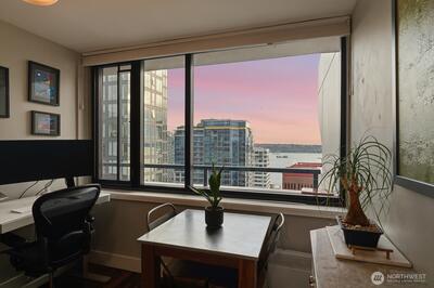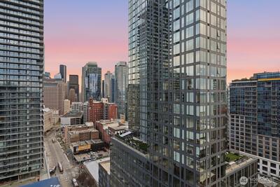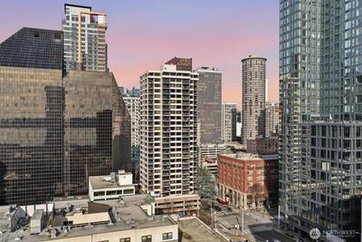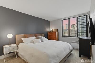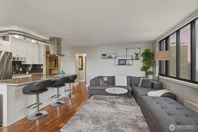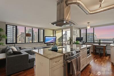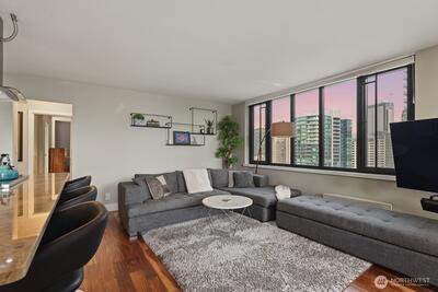 This luxurious penthouse at Royal Crest is where year-round vistas take center stage: come home each day to panoramic views of the Olympic Mtns, Elliott Bay, glorious sunsets & twinkling downtown lights. The iconic downtown lifestyle is yours from this unbeatable location w/ immediate proximity to all the best dining, shopping, nightlife, sports & cultural events the city has to offer. Be at the heart of it all! Perched 26 floors above the city, this corner unit's layout has been opened up to maximize the views from nearly every room. Warm western light accentuates luxe finishes like engineered hardwood floors, Hunter Douglas top-down/bottom-up blinds & a remodeled kitchen outfitted w/ quartzite counters, stainless appliances, stylish cabinetry & a large center island perfect to gather around. Both beds look out to fantastic views & the sparkling skyline; the primary is bright & spacious w/ a full ensuite bath, & the 2nd bed includes a Murphy bed & custom closet organizers. Free laundr