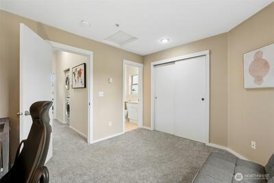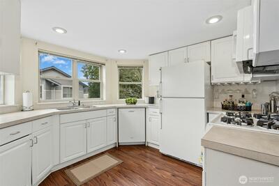 Tucked away in a quiet North Seattle setting, this townhouse-style end unit lives like a single-family home — offering privacy, space, and the kind of versatile layout that's rare in condo living. Spread across three levels, this 2-bed, 2.5-bath plus potential 3rd bed gem delivers 1,216 sq ft of thoughtfully designed space ideal for hosting gatherings and welcoming guests. The main level flows seamlessly from a cozy gas fireplace living room to a dedicated dining area and a well-equipped kitchen with gas cooking. Step outside to enjoy territorial views from your private fenced deck and yard — a true urban retreat. Upstairs, two generously sized bedrooms each feature their own en-suite bath, with bedroom floor hallway in-unit washer/dryer for added convenience. The entry level offers a finished bonus room perfect as a home office, gym, or convert to conforming third bedroom — plus an attached garage with extra storage plus a second, dedicated uncovered parking space. Pets welcome
