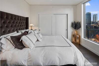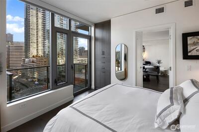 Celebrate luxury living at Spire — Seattle's premier condominium at the heart of South Lake Union, Belltown, and Denny Triangle. This exceptional 11th-floor, one-bedroom residence offers sunny southern exposure from floor-to-ceiling windows with breathtaking views of the city skyline. Residence #1103 is thoughtfully upgraded with $12,500 in custom finishes, including a designer kitchen island with added storage and seating. California closets and custom cabinetry in the bedroom and entry create seamless, functional living spaces. The L-shaped kitchen features premium Bosch appliances. Soaring 9-foot ceilings and expansive windows create an airy, lofty home. The serene bedroom retreat extends to a private balcony — an intimate vantage above the city, perfect for morning sunrises and evening unwinding.Just moments from Amazon, Google, and Seattle's most celebrated dining and cultural destinations, including the Space Needle and Pike Place Market. This residence offers unparalleled ac