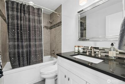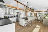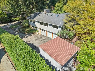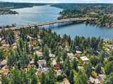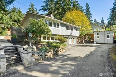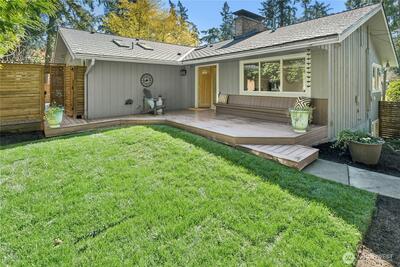 Enatai Waterfront Community - Charming home on a private lot, blending timeless character with modern updates—move-in ready & designed for entertaining. A welcoming entry & cozy fireplace set the tone, leading into a sun-filled, spacious living room with a striking brick accent wall. The gourmet kitchen features high-end stainless Steel appliances, abundant storage, and a charming dining nook, with easy flow into the main living spaces. Surrounded by mature landscaping, this home enjoys a serene natural backdrop—perfectly complemented by an expansive Trex deck oasis, ideal for hosting guests for a BBQ or an outdoor movie night. The main level offers two bedrooms, including a primary suite with a spa-like bath, a large closet with organizer system, a stack washer/dryer, and direct access to the hot tub & private deck retreat. The lower level offers a well-appointed guest suite with a private entrance, full kitchen, living space with fireplace, bedroom, bath, and laundry—ideal for
