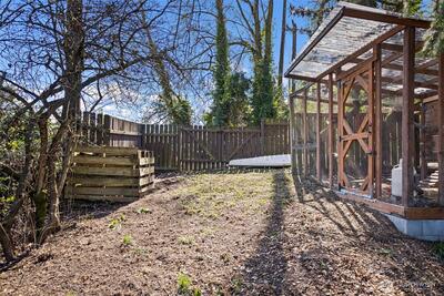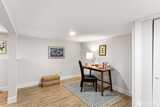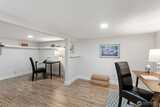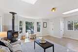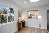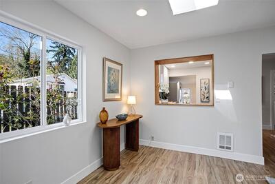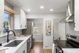 A 1915 South Park bungalow on a quiet corner — cobblestone path, covered entry, mature trees — thoughtfully updated and ready to live in. The main floor centers on a generous living room with two skylights, a bay window, and wood stove set on a stacked stone base. A renovated kitchen features new cabinetry, quartz countertops, undermount sink, blue-grey subway tile backsplash, west-facing window, and stainless appliances including a never-used range. A serve-through opens kitchen to the living room; a full open-cased passage with quartz ledge connects living room to dining — borrowing light front to back. A renovated ¾ bath off the dining room keeps guest traffic on the main floor. A spiral staircase leads to the lower level — bonus room and laundry give way to a daylight corridor where the lot's natural slope brings the bedrooms and full bath to grade, with full-height windows and ground-level exterior access. The primary bedroom features a custom walk-in closet, direct garag