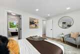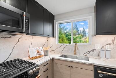 Tucked at the end of a quiet cul-de-sac and backing to a serene park, this beautifully updated split-level home offers modern living with privacy and natural light. Set on a manicured, sun-filled quarter-acre lot with mature trees, the setting is both open and secluded. Inside, enjoy a fully remodeled interior with contemporary finishes throughout. The stunning kitchen features a slab quartz waterfall island, custom cabinetry, under-cabinet lighting, and pop-up charging stations. Wide-plank LVP flooring and tile run throughout—no carpet. The open main level is anchored by a striking gas fireplace and modern lighting. The primary suite offers a spa-like bath with a freestanding soaking tub and a large walk-in shower. The lower level includes two bedrooms, a spacious rec room with a wood-burning fireplace, and a finished laundry room. Recent updates include a new tankless water heater, new windows, and fresh interior and exterior painting. Outdoors, enjoy a landscaped ya