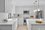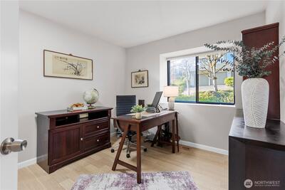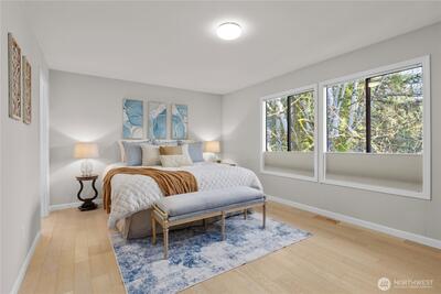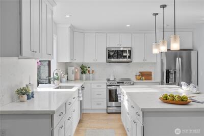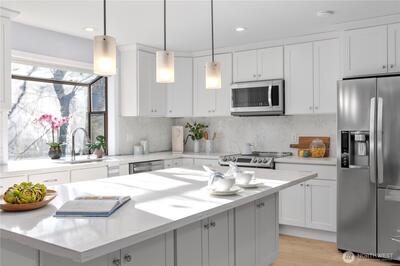 Welcome to Wildridge Park! This stunning, fully remodeled stand-alone home features 2 kitchens, 2 laundry rooms, and a separate-entry daylight basement—perfect for a mother-in-law suite. Enjoy soaring ceilings, A/C, skylights, and a gas fireplace in the bright, open living room. The chef’s kitchen boasts a quartz slab island, stainless steel appliances and has a slider glass door open to a large private deck. Luxury vinyl plank floors throughout. Spacious primary suite with walk-in closet, freestanding tub, and designer shower. A huge storge room in the basement. Bellevue Schools, easy I-405/I-90 access. Desired Bellevue School District; EZ access I405 & I90