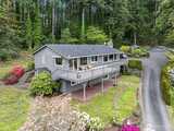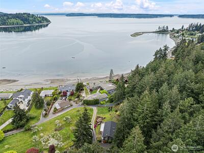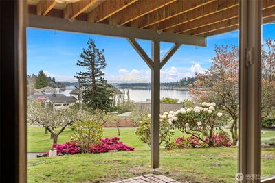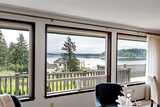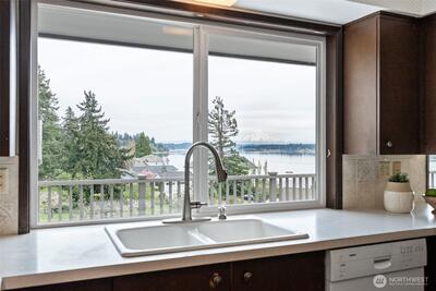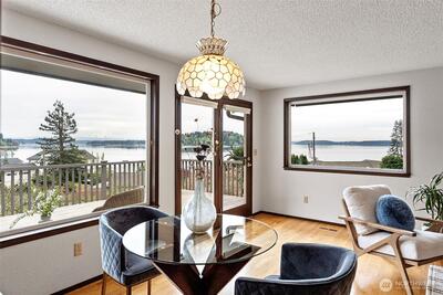 Perched on a hillside in a prime location of Gig Harbor, this 2,900 sq. ft. home delivers sweeping, front-row views of Mt. Rainier, Hale Passage, Fox Island, & the iconic Fox Island Bridge, where breathtaking sunrises & glowing sunsets become part of your everyday rhythm. Nearly every room captures the views & is filled with light, water, & sky. This 3-bedroom offers a spacious, inviting layout with oak hardwood flooring adding warmth & character, while a gas fireplace anchors the main living and dining areas & creates a cozy place to gather. The expansive deck is perfectly positioned for barbecuing, entertaining, or simply relaxing as boats pass & the scenery shifts throughout the day, while the large rec room with wood burning fireplace offers additional space for hosting or unwinding. A dedicated office provides flexibility for work or hobbies, & the functional kitchen with built-in buffet is ideal for serving & for formal or casual gatherings. With AC, a newer roof, a basement wor