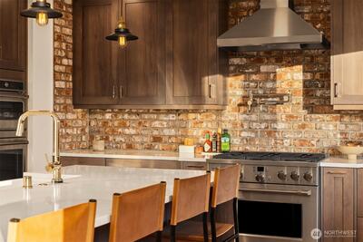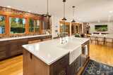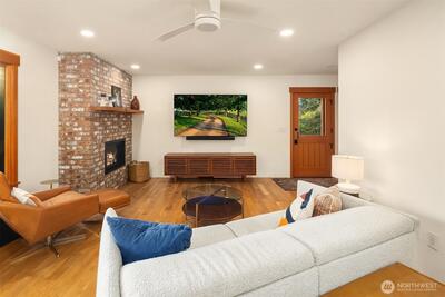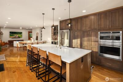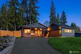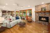 Reimagined NW style modern rambler rebuilt down to the structure/studs with intention, quality, & timeless design in mind. This architectural showstopper blends bold design, warm natural materials, & refined finishes to create a home that is both unforgettable & highly livable. Expansive wood-wrapped windows fill the home with natural light, while hardwoods flow seamlessly from room to room. At the heart of the home is the kitchen that blends style & function w/Huntwood custom cabinetry, matching GE Café series appls incl a 6-burner gas cooktop, quartz counters, pot filler, brick backsplash, built-in wine/bev fridge & abundant storage. A place for gathering, planning, homework, cooking, & culinary creativity, all centered around a generous chef’s island. Fir doors & trim, cedar soffits, A/C, high-end ceiling fans, & a gas fp w/ custom solid wood mantel add comfort & character. The primary offers an ensuite bath w/ high-end sink faucet & Hansgrohe shower fixture, while radiant heated