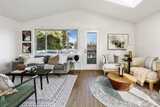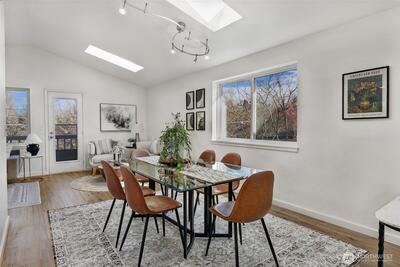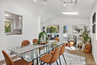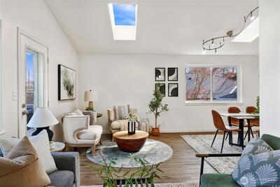Welcome to a spacious contemporary home that offers a highly adaptable floor plan and move-in ready condition; the open living areas feel warm and welcoming, enhanced by vaulted ceilings and skylights that fill the main floor with natural light. The newly updated kitchen is a joy to cook in, and two dining spaces make hosting effortless. A generous lower-level bonus/family room provides numerous possibilities and has plumbing for a potential wet bar. Recent upgrades—including updated systems, a new water heater, new roof, fresh exterior paint, and all-new flooring— offer the prospect of low-maintenance living for years ahead. Commuting and outings are easy with nearby bus line 131 offering direct access to the stadiums and downtown. Additional conveniences include off-street parking in the wide driveway, a detached backyard storage shed, and alley access for simple upkeep or project deliveries. Situated near Westwood Village, Westcrest Park, Boeing Field, and a variety of shoppin