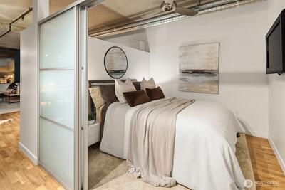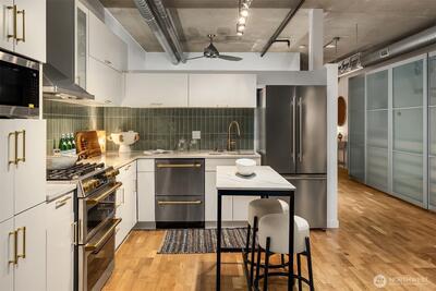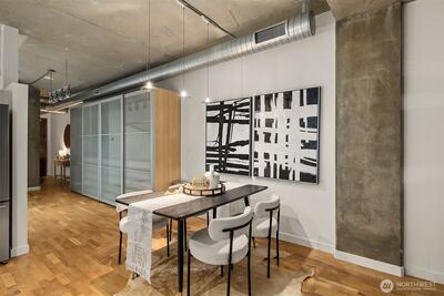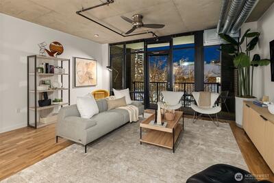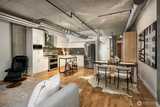 Over $50,000 in recent updates at the iconic Mosler Lofts. This west-facing residence blends industrial character with modern luxury, featuring soaring floor-to-ceiling windows that flood the open living and dining spaces with natural light and open to a private balcony. Thoughtful upgrades include a remodeled kitchen, updated flooring, new appliances, an upgraded bathroom, and custom built-in closets and vanities. The stylish kitchen is designed for entertaining, and secure garage parking adds everyday convenience. Mosler Lofts is a 12-story LEED Silver/Built Green condominium known for its steel and concrete construction, 10-foot ceilings, and loft-style design. Residents enjoy premier amenities including a 24/7 concierge, controlled access, fitness center, library and clubroom, conference and lounge spaces, guest suite, EV-ready parking, storage, and a stunning rooftop garden with fire pit and BBQ, offering mountain and water views. Located in the heart of Belltown, this walkable ur