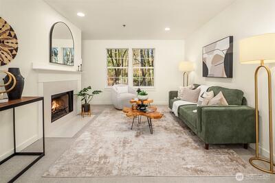 Experience exceptional space in an unbeatable location in this sought-after Bellevue residence! This thoughtfully designed 2 bed, 2 bath private end-unit checks all the boxes, offering rare stair-free access and a secure individual garage conveniently located right outside your front door. Inside, enjoy beautifully updated interiors featuring a modern kitchen with soft-close cabinets, quartz countertops, induction range, new dishwasher, and water heater, along with tastefully refreshed bathrooms. You're welcomed inside by an open layout surrounded by sunny SW windows and a wood-burning fireplace. Enjoy the comforts of a full-size washer & dryer, newer carpets, and fresh paint—creating a warm, move-in-ready home that maximizes both comfort and space. Step through elegant French doors to your private balcony overlooking a lush Pacific Northwest greenbelt—perfect for entertaining or relaxing. The location truly sets this home apart: just minutes to downtown Bellevue, top-rated schools