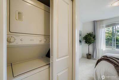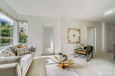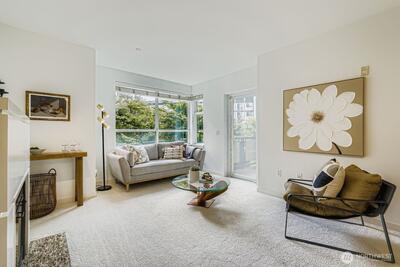 Experience everything Ballard has to offer in this lovely 1 bed, 1 bath condo featuring a private deck surrounded by trees. Walk to restaurants, the Olympic Athletic Club, shopping, activities, and more. This location is as central as it gets in Ballard. Freshly painted throughout with brand new carpet, the unit offers abundant natural light, a walk-in closet, and an in-unit washer and dryer. Additional highlights include private garage parking, a secure package room, sauna, exercise room, hot tub, and shared party and meeting spaces. This complex is exceptionally well-managed, with on-site management.