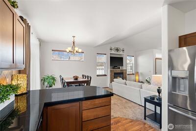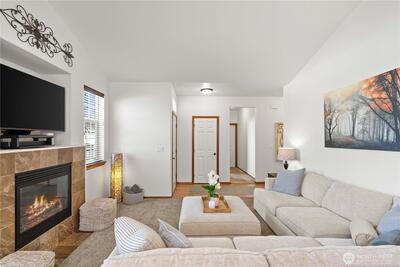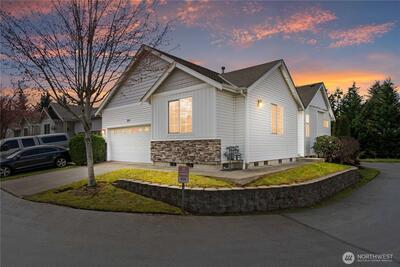 Stylish single-level condo in the heart of downtown Puyallup with an attached 2-car garage, offering the ease of low-maintenance living with thoughtful upgrades throughout. Vaulted ceilings and a cozy gas fireplace create a warm, open living space filled with natural light. The kitchen features hardwood floors, granite countertops, full tile backsplash, rich cherry cabinetry, and newer stainless steel appliances. Recent updates include fresh interior paint, brand new refrigerator, washer and dryer, new hot water heater. All bedrooms are generously sized, including a spacious primary suite with a private full bath and ample closet space. A dedicated laundry room and large hall closet add to the home’s functionality and air conditioning for year-round comfort. Step outside to enjoy a nicely sized deck overlooking your private, low-maintenance backyard with updated landscaping perfect for relaxing or entertaining. HOA maintains the front yard for easy living. Ideally located just min