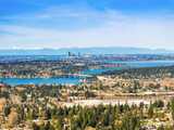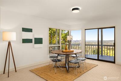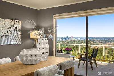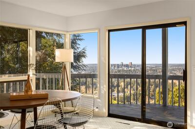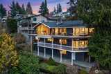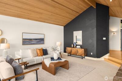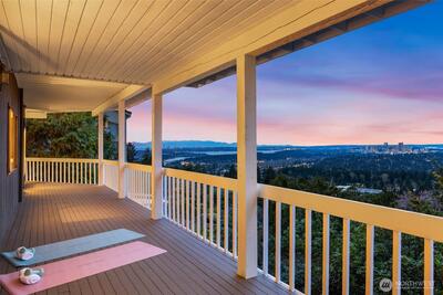 Rare Somerset view home with sweeping panoramas of Lake Washington, the Olympics & Cascades, spectacular sunset, Seattle & Bellevue skylines — enjoyed from nearly every space! Vaulted wood ceilings, a statement stone fireplace, and rich hardwoods offer a warm nod to mid-century modern design, while walls of windows frame the ever-changing scenery. Over 4,000 sqft of vacation-inspired living with a private, landscaped entry, two expansive living areas, three view decks designed for effortless indoor-outdoor living, and laundry on both levels. Entertain with ease in the spacious dining area with wet bar, or unwind in the lower level featuring a projector-ready second living room, fireplace, and built-in bar. A rare view bonus room with separate entry offers ideal flexibility for an office, gym, studio, or guest suite. The main-level primary suite is a true retreat with a 5-piece spa bath, custom walk-in closet, and private deck. The lower level features two spacious bedrooms plus a t