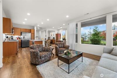 Exquisite Maple Valley Home Offering a Perfect Blend of Sophistication & Comfort. One Level Living Nestled in the Desirable Meadow Ridge 55+ Community. This Stunning Home is a Rare Find! Spacious Living with a Beautifully Appointed Chef's Kitchen Equipped with a Large Island, Stainless Appliances & Modern Stove with Air Fry Option. Quartz Counters & Luxury Vinyl Floors Add Elegance Throughout. Light & Bright with Soaring 10' Ceilings & Expansive Windows. Primary with Spacious EnSuite & Walk-in Closet. Expansive Windows to let the Sun Shine Throughout. Relax on the Large Covered Back Patio with Small Turf Area. The Covered Back Patio Overlooks Tranquil Open Space. Engage in a Vibrant Lifestyle with Access to the Beautiful Community Club House that Hosts a Variety of Indoor & Outdoor Events. The Perfect Retreat for Those Looking to Enjoy Life in a Welcoming Community! Very Walkable! AC! Wired for Generator!