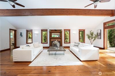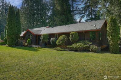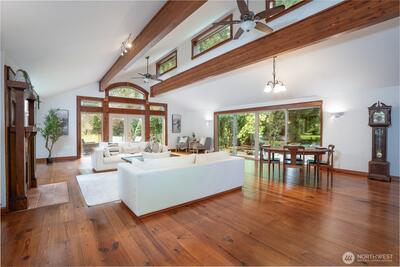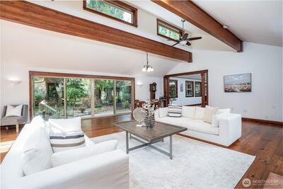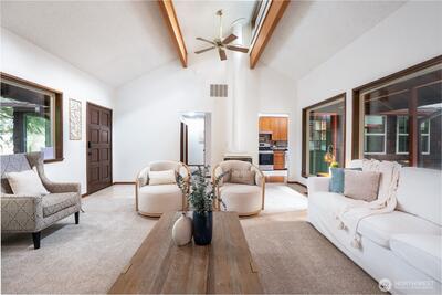 Welcome home to this stunning Northwest retreat offering main-level living, a large shop, & a private setting just minutes from downtown Orting with NO HOA. New carpeting, updated appliances, and beautiful landscaping with year-round flowers make this a truly turnkey home ready for its next owner. Inside, you’ll find an impressive 24x32 great room with soaring 15-foot open beam ceilings, abundant natural light, & a cozy, gas fireplace - creating the perfect space for both everyday living and entertaining. The custom kitchen with vaulted ceilings provides an inviting space for cooking and gathering, with a layout that flows seamlessly through the main living areas.  The spacious front sitting room has two wood-burning fireplaces for those fall evenings. Situated on a beautifully landscaped property with mature trees, fruit trees, & garden space, this home captures the essence of Pacific Northwest living. Enjoy outdoor entertaining, summer barbecues on the wrap-around deck, & peaceful