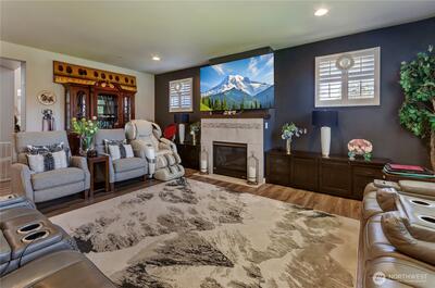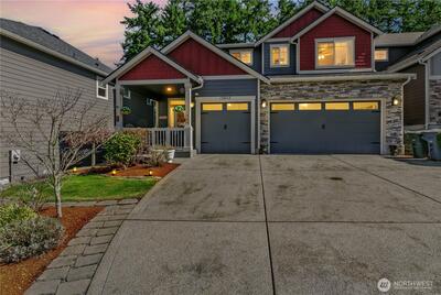 Outstanding home with ample amenities by Award winning Builder of the year- Rush Residential. Starting downstairs there are soaring ceilings, ample windows, gleaming laminate hardwoods, designer paint selections and a kitchen space built for entertaining with stainless appliances, quartz counters and full height tile backsplash. The outdoor living space is covered and includes fireplace, covered hot tub and firepit. There are 4 Bedrooms upstairs and a den/office on the main. One bedroom could be considered a bonus room but also has a closet. The primary bedroom suite is spacious and includes stand alone tub, tile shower with glass surround and tile flooring. To top it off there is a 3 car garage, permanent exterior lighting with every color combination you can imagine and the HOA dues include front yard maintenance.