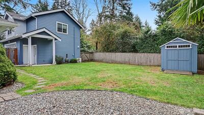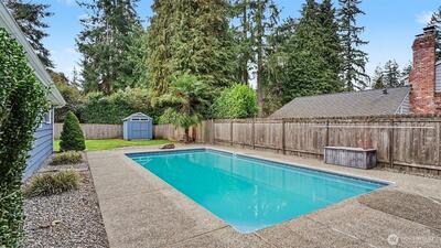 Welcome to this stunning Mercer Island home offering a total of 2,950 sq ft, including a beautifully designed 4-bedroom, 2.25-bath main residence and a 610 sq ft detached ADU—perfect for rental income, guests, or multi-generational living. Inside the main home, hardwood floors and expansive windows create bright, inviting living spaces. The modern kitchen features natural-toned cabinetry, stainless steel appliances, recessed lighting, and a large island with sink and seating—ideal for both everyday living and entertaining. A dual-sided fireplace adds warmth and character, while a versatile den, mudroom, A/C, and a well-appointed laundry room with utility sink enhance functionality. The detached 2-car garage includes the fully equipped ADU, complete with a kitchenette, washer and dryer, Murphy bed, and a ¾ bath—offering incredible flexibility and value. Step outside to a fully fenced, level backyard designed for relaxation and entertaining, featuring a saltwater pool and a covere