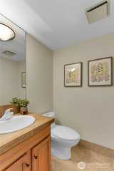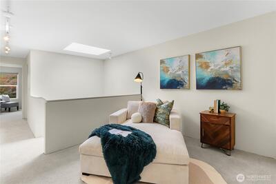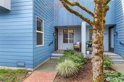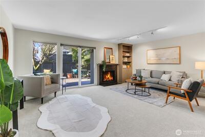 This spacious 1,700 sqft home has been updated and is move in ready with new carpet and paint throughout! Office off entry as well as convenient half bathroom. Parquet floors flow to the kitchen with stainless steel appliances, granite counters, and eating area. The dining area opens to the living room with wood burning fireplace and access to the fenced backyard with deck! The large landing upstairs is a great flex space that could be used for an additional office, reading nook or TV space. Roomy primary suite boasts personal deck, double closets, double vanity, heated floors, and deluxe walk in shower. Additional bedroom upstairs and full hall bathroom with tub. Private 2 car garage directly in front of unit, as well as guest parking. A short walk to restaurants, coffee, Spin Alley Bowling, and only 10 minutes to the Saltwater Park! Pre-inspected for your peace of mind, ask your agent!