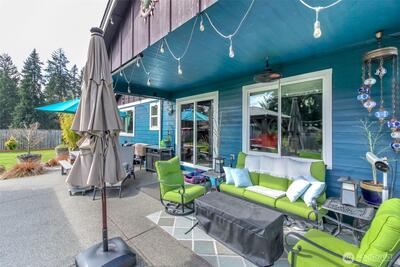 Summertime entertaining will happen here! Level one acre landscaped oasis! Private, oversized patio with Gazebo, firepit, outdoor water feature with custom lighting features, sprinkler system with 10 stations, landscaped settings, perennial gardens, and landscaped trees. RV parking, oversized 30'x30'x14' pole barn/shop/carport with 30 amp hookup; perfect for storing RV, Boat, Quads, Lawn Tractors, Cars, and much more. Large studio shed with covered porch and 100 amp power. Wood and lawn tractor barn. Fully fenced level yard. Perfect opportunity for a possible DADU-detached accessory dwelling unit (please verify all information with local Pierce County Planning Dept.) One level living with open floor plan. Custom cook's kitchen with solid granite counters, stainless appliances, and wood cabinetry. Vaulted ceilings in great room, open to kitchen and dining room. Luxury plank floors, wall to wall carpet in the hallways and bedrooms. Low maintenance living. Primary suite offers sp