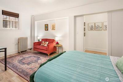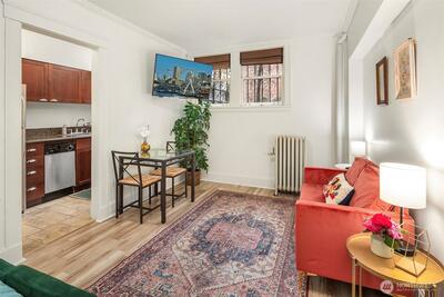Fantastic opportunity to build your short-term rental/Airbnb portfolio with this high-demand studio condo in Belltown! Fifth Avenue Court offers owners the rare opportunity to rent their units nightly, and when you're blocks from the Spheres and the best Downtown Seattle has to offer, this unit is in demand year-round. The historic brick building welcomes residents and guests with a marbles staircase and Ionic columns; a coveted courtyard-facing unit, you can easily unwind in this quiet oasis in the heart of the city. Efficient design includes full kitchen with granite counters and gas stove, washer/dryer in unit and walk-in closet. Offered turn-key with furnishings and ready to rent for World Cup!