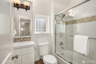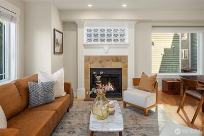 Modern living meets an unbeatable Seattle location with this stylish and spacious three-bedroom plus loft, 2.5 bath town home on a quiet street walkable to parks, shops and restaurants. An elegant gate with custom metalwork welcomes you to a private and fully fenced courtyard. Thoughtfully designed with an open floor plan perfect for entertaining and flooded with natural light. A cozy gas fireplace, and a balcony off the living room add to the ambiance - perfect for morning coffee or summer dinners. Freshly painted from top to bottom, maple hardwoods on main, and brand new carpet throughout. Chef's kitchen with granite countertops, maple cabinets and updated stainless appliances. Vaulted ceilings elevate the upper-level bedrooms, while the primary suite offers glimpses of the Cascades and a versatile loft perfect for a home office or flex space. With an attached garage and a second off-street parking spot, everyday living is seamless - all just minutes from Green Lake, Northgate Light