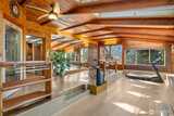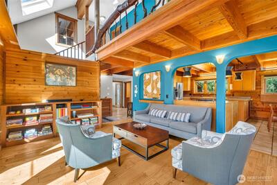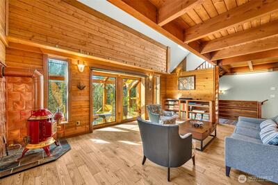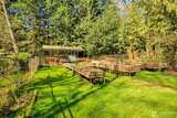Tucked away on over five secluded, forested acres in N. Olympia, this nearly 4,000 sq ft custom home offers a rare blend of solitude, space, and lifestyle. A gated entry welcomes you into a peaceful setting surrounded by mature trees, curated gardens, and productive fruit plantings. Designed for both comfort and flexibility, the home features 3 bedrooms and 3 bathrooms (one one each floor), 2 offices w/closets, with expansive living areas on both the main level and lower level. Also 2 freestanding stoves/fireplaces on main level. Two sun-filled solariums create year-round indoor/outdoor living, while the ample sauna and gym space offers an upscale retreat. Multiple covered exterior decks extend the living space into the surrounding landscape. Primary bedroom skylights let the gentle rain showers lull you to sleep. The third-floor studio with rooftop deck provides an inspiring setting for work, creativity, or quiet refuge. Spacious detached garage for cars and work. Outside, the propert