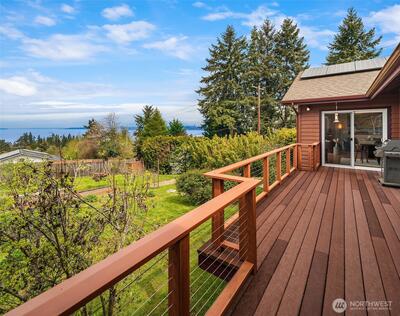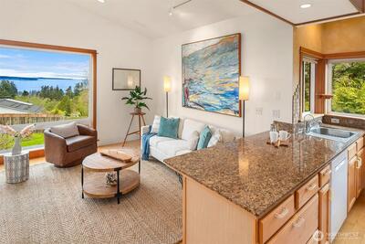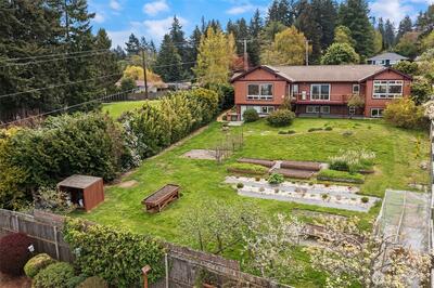 Custom-built Vashon Island home within moments of ferries to Seattle. Views of Sound, city and even Mount Baker enliven this beautifully built, lovingly maintained one-owner home with gorgeous fir trim, hardwood floors and a fantastic floor plan. Generous light-filled great room with vaulted ceilings and easy access to view-side deck overlooking the thoughtfully designed garden with fruit trees, berries & raised veggie beds. Entry patio greets you with flagstones, mature landscaping & a lovely pond with waterfall. Fresh carpet leads you down the hall to the view primary suite -- and the huge secondary bedroom with vaulted ceiling, skylights, storage cabinets, sink & its own view-side deck access. Plenty of room to add another bath here for another primary suite. The atrium has been the home of many a tropical plant; makes a wonderful sitting room off the bedroom, too. The lower level has another bedroom, 3/4 bath, office space, shop with exterior door & tons of warm, dry storage; even