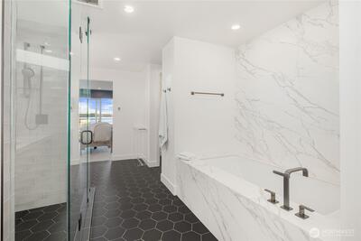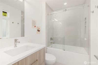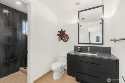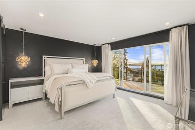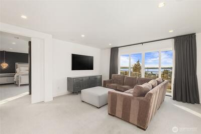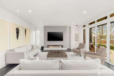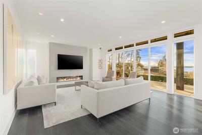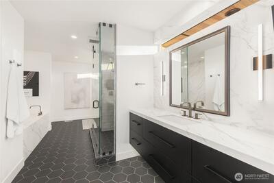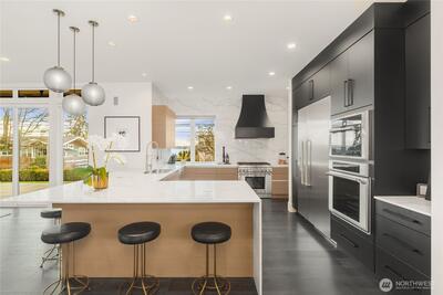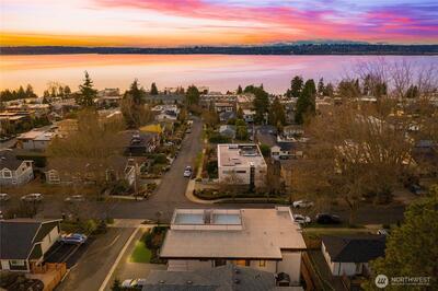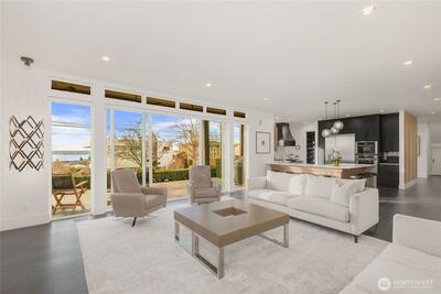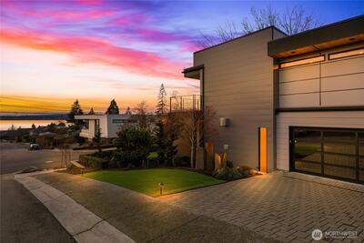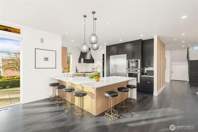 Timeless elegance meets bold design in this contemporary retreat, commanding attention with striking aesthetics and sweeping views. Set in desirable Houghton, just steps from Met Market & Lakeview Elementary. Rich black hardwoods anchor the main level, featuring a sleek chef’s kitchen with moody cabinetry, waterfall quartz island, & Thermador appliance suite with steam oven. Entertain in the expansive great room with linear gas fireplace & high-end audio system that flows to a heated view patio & turf yard. A dining room perfect for hosting, complemented by a guest suite, 3/4 bath, & private office. Upstairs find 3 en-suites including a luxurious primary with heated floors, dual shower, & absolutely giant closet. Access to a large view deck from primary & bonus room. Above it all, the rooftop deck offers stunning views of Lake Washington & Seattle skyline. Oversized 2 car garage wired for EV charging, elevator, hydronic heated floors, backup generator & fully motorized shades elevate