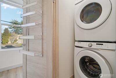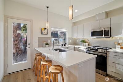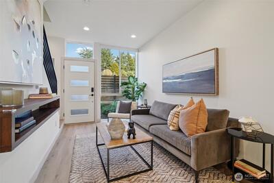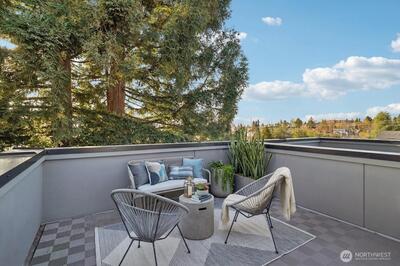 This elegant and sharp Roosevelt residence showcases contemporary design at its finest. An open floor plan and extended walls of windows create a bright, airy atmosphere that enhances both everyday living and effortless entertaining. Clean, polished lines carry throughout the home, reinforcing its modern aesthetic. The spacious primary suite offers a serene retreat with a spa-like bath designed for relaxation. The thoughtfully appointed kitchen features a large central island, rich quartz surfaces, custom built-in cabinetry, and stainless-steel appliances—an ideal setup for any culinary enthusiast. Unwind on the rooftop deck, where stunning mountain, lake, and city views provide a breathtaking backdrop. The home is nestled in a park-like setting with the added convenience of nearby transit. Best of all, you’re just a five-minute walk to the Roosevelt Light Rail Station, offering seamless access to downtown Seattle and beyond. Safeway sits just around the corner, and Green Lake is a