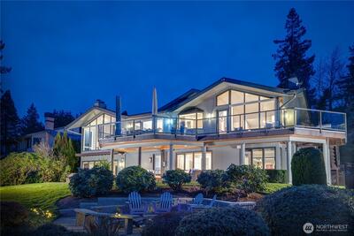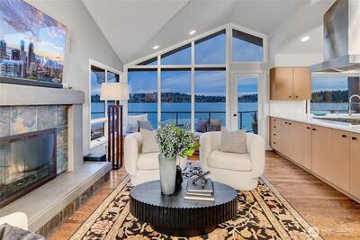 Get ready for summer at the lake! Located on coveted Meadow Lane on the west side of Mercer Island, this rare no bank Lake Washington waterfront home offers 95 feet of private shoreline, a private dock and an additional 1/8 interest in shared community waterfront. Rarely do west side Mercer Island waterfront homes become available on this quiet lane, and true no bank access to Lake Washington is even more uncommon. Sweeping 180 degree west facing views stretch across Lake Washington toward Seward Park, delivering stunning sunsets and front row seats to year round lake activity. Vaulted ceilings and expansive windows capture the water from the main living areas, while the remodeled kitchen opens to the family room and generous living and dining spaces, creating an ideal circular floor plan for both intimate gatherings and larger Seafair celebrations. Multiple view decks extend from the kitchen, family and living rooms, perfectly positioned for entertaining. Enjoy the quiet courtyard w/