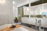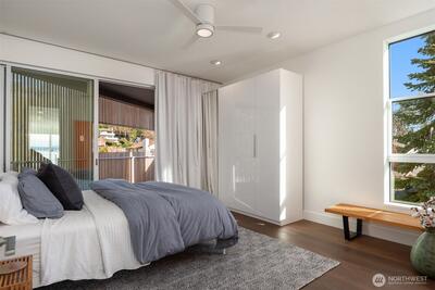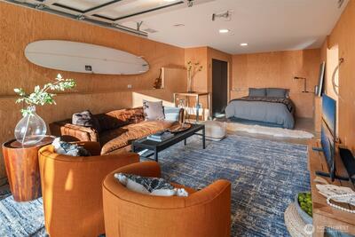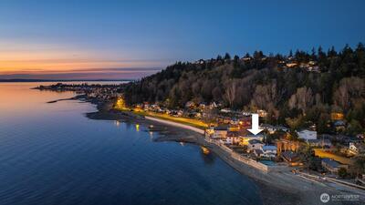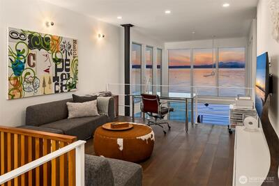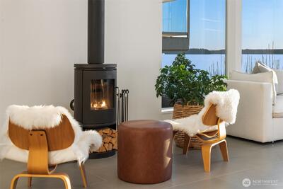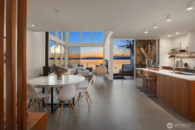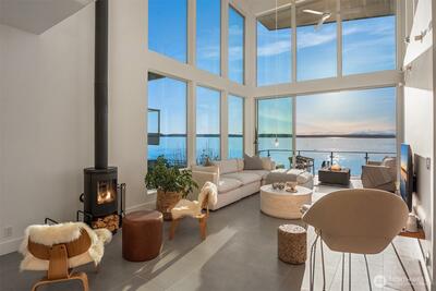 A private waterfront reveal on West Seattle’s coveted Beach Drive. Built in 2023, this architectural home reads as a sculptural cedar-clad form from the street—minimal, restrained, and intentionally discreet behind cedar privacy screen slats and a secure gate. Step inside and everything shifts. A dramatic 2-story living room with a Fleetwood window wall slider opens to sweeping views of Puget Sound & the Olympic Mountains, w/ a deck just off the main level for seamless indoor-outdoor living. Anchored by a Danish wood stove, the space feels both modern & warmly grounded. The adjoining kitchen pairs walnut cabinetry, induction cooking, and high-end European appliances with clean architectural lines that keep the focus on the view. From the shoreline, the home becomes open and fully in conversation with the Sound. Nearly 40 feet of waterfront with tideland rights and deeded buoy bring paddleboarding, wildlife, and sunsets into daily life. A skylit staircase leads to a lofted den and a
