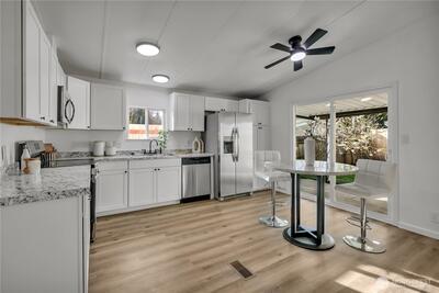 Hurry on this incredible opportunity—affordable manufactured home priced to sell! located in Desirable Sunnydale this light-filled home offers a spacious open layout with vaulted ceilings that create an airy, expansive feel throughout. Featuring 3 bedrooms and 2 full baths, the floor plan is both functional and inviting. The kitchen is equipped with stainless steel appliances—including range, microwave, dishwasher, and refrigerator—and flows seamlessly into the generous living area, making it ideal for everyday living and entertaining. Beautiful newer flooring and abundant natural light enhance the warm, welcoming interior. Step outside to a large yard with endless potential—perfect for gardening, fruit trees, outdoor living spaces, or simply enjoying the open space. Plenty of off-street parking adds convenience. Move-in ready and full of value, this home is a fantastic opportunity for homeowners or investors alike. Also, the Park has an outdoor pool which opens around Memor