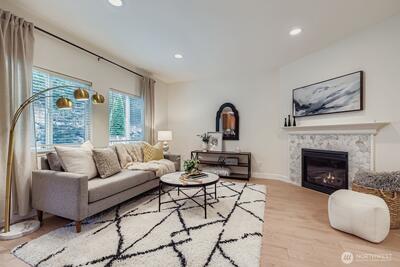 Perched in the desirable Woodridge at North Creek, this beautifully maintained home blends thoughtful design with modern convenience. The main level features wide-plank floors, a bright open layout, gas fireplace, & a chef’s kitchen with granite counters, SS appliances, gas cooktop, walk-in pantry, and smart fridge. A main floor bedroom and full bath offer flexibility for guests or office. Upstairs includes a spacious loft, two more bedrooms, full bath, laundry room, and a large primary suite with sunset views, oversized walk-in closet, dual sinks, and soaking tub. Enjoy central A/C, Level 2 EV charger outlet, 1 gig internet speed, landscaped yard with deck and gazebo, community trails, playground, and easy access to I-405.