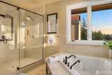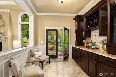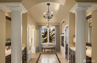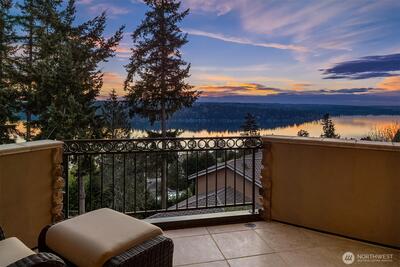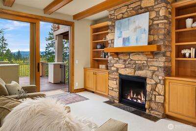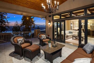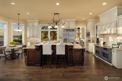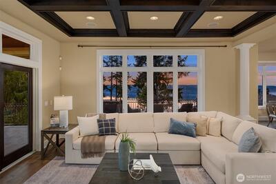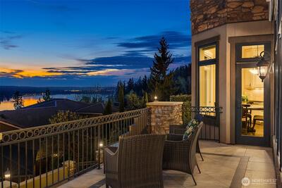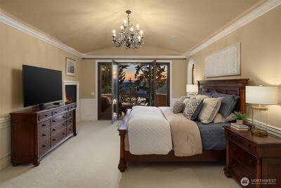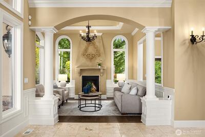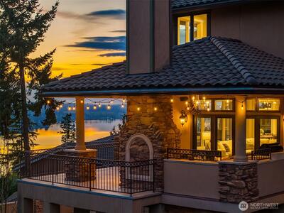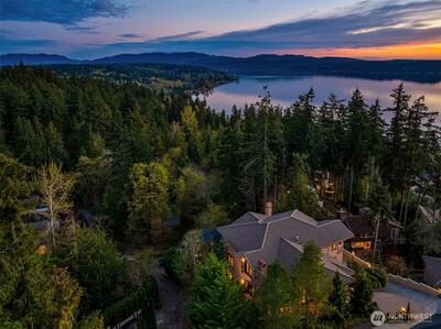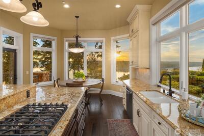 As dusk settles over Lake Sammamish, the terrace becomes the heart of the home, firelight flickering as views stretch from water to mountains. Eagles pass just beyond the railing, and the setting feels expansive and entirely private. Mornings arrive softly, with light filtering across the lake and through the surrounding trees. Privately set above the shoreline, the estate is defined by scale, light, and enduring craftsmanship. Inside, soaring ceilings and walls of windows frame the landscape, while coffered detail, hickory doors, and custom millwork add warmth and depth. Six fireplaces create comfort and quiet luxury throughout. At the center, a thoughtfully designed kitchen balances presence and performance, with dual ovens, a gas range, and generous granite counters. A sunlit breakfast area and adjacent family room open to a covered outdoor living space with fireplace and built-in kitchen, ideal for both intimate evenings and gatherings. A main-level office is thoughtfully positione
