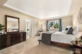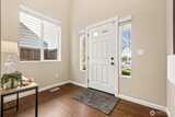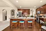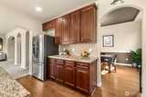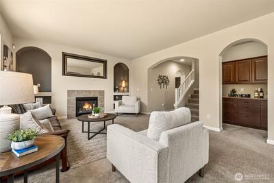 Remarkable 2-story in the beloved Country Club Village area—perfectly positioned with views of the horse farm across the street and the Cascade Mountains beyond! This home offers an ideal layout with a quiet, insulated feel and private setting. Architectural charm shines throughout with curved archways, built-in coved shelving, thoughtful niches, specialty molding details, and ceiling accents, complemented by engineered hardwood flooring and fresh interior paint. The kitchen features a gas range, stainless steel appliances, granite tile countertops, and a spacious dining area, with an expansive slider opening to the inviting backyard—perfect for summer evenings and entertaining. A versatile nook off the kitchen and family room is ideal for a workstation, buffet, or coffee/wine bar. Enjoy a formal dining room with chair railing and a coffered ceiling. The warm and welcoming family room includes a gas fireplace and built-in shelving with integrated lighting outlets. Upstairs offers